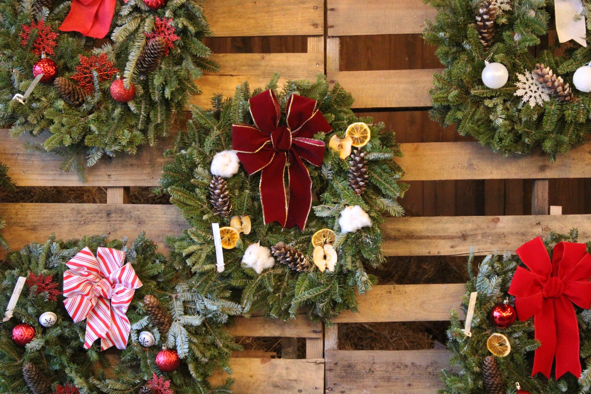An farmhouse classic Fraser wreath with a burgundy bow, accented burgundy balls, dried fruit, and pine cones.